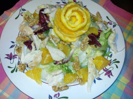Lechuga naranja nueces aceite vinagre cachos de pollo y mango