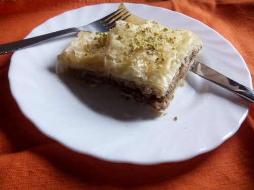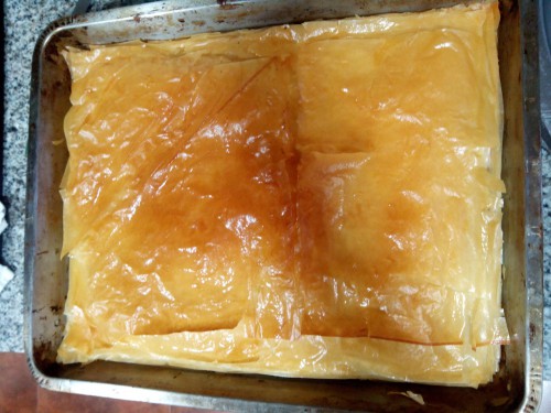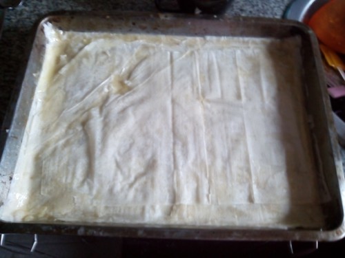 Coger una bandeja de horno y empezar a poner las hojas de pasta filo una a una extendiéndolas con una brocha huntada en mantequilla(muy poca) pero procurando que cubra toda la hoja. seguir con este proceso hasta haber usado la mitad de las hojas de pasta filo y ponerle el relleno para a continuación seguir con el mismo proceso hasta acabarlas.