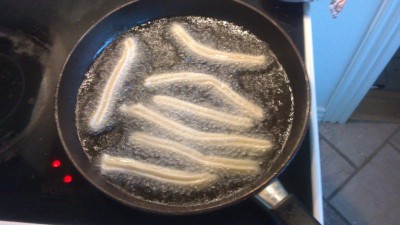 En una sarten poner el aceite de girasol o de freir,( ya que el aceite de oliva le resta sabor al churro) y cuando esté bien caliente empezar a freir hasta que estén dorados.