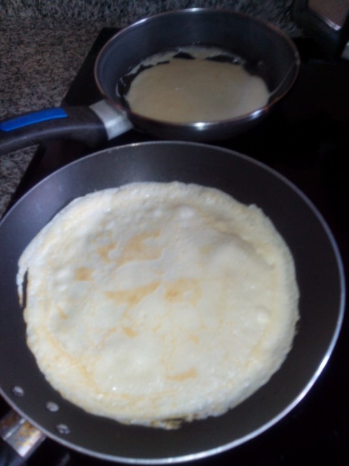 Poner una sarten mediana en el fuego y untarla con mantequilla y hacer los frisuelos lo mas finos que puedas. Ponerlos en un plato según se van haciendo y taparlos para que suden y reservarlos.