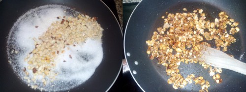 Hacer un caramelo con la mezcla y pasarlo a un papel de horno hasta que se enfrie y triturarlo si quereis (eso lo dejo al gusto de cada uno)