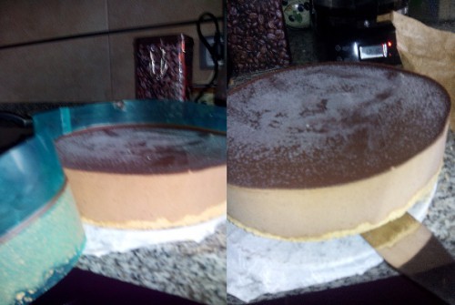 Verter la mousse con cuidado sobre la base de las galletas y meterlo en el congelador hasta que se cuaje y cuando veais que ya está cuajada, poneros con la cobertura.
