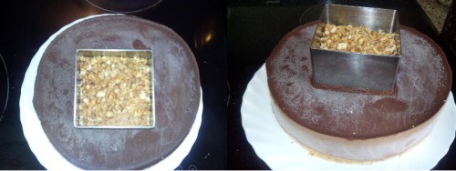 Una vez desmontada ponerle un molde con la forma que querais en el centro para adornarla con el crocanti que habiamos preparado anteriormente.