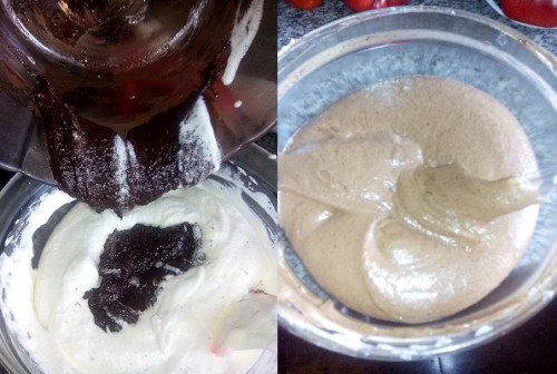 En el bol donde batimos las claras añadir poco a poco la nata montada con las yemas en un movimiento envolvente para que no pierda el cuerpo la mousse y al final añadir el chocolate que anteriormente habeis mezclado junto con la nata y la gelatina revolviéndolo hasta que el color quede homogéneo.