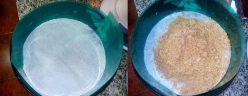 Forrar la base desmontable del molde con papel vegetal, colocar el aro, cortar el papel que sobra y reservar.