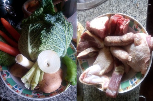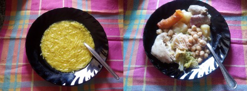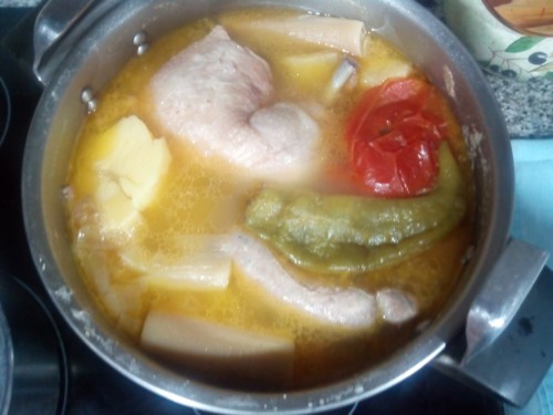 Cuando lleve 20 minutos cociéndose, apagar el fuego y añadirle las patatas cuando podais abrir la tapa y volver a ponerlo al fuego hasta que se termine de cocinar. Una vez cocinado dejarlo reposar y media hora antes de comer, sacar el caldo y hacer la sopa.