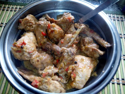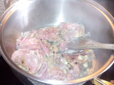 El dia anterior cortar el conejo en trozos y dejar que macere toda la noche con los 3 dientes de ajo machacados con su piel, la sal el perejil y un chorro del vino que vayas a usar.