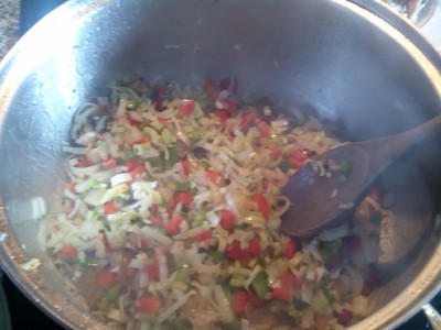 En una olla grande freir el conejo con las 8 cucharadas de aceite por partes, sacarlo y reservarlo.