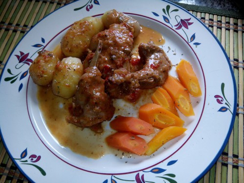 Poco antes de que se acabe de hacer el conejo, poner en otra olla los patatinos (patatas muy chiquitinas) y las zanahorias a cocer enteras con un poco de sal y cuando esté todo emplatarlo y listo para comer.